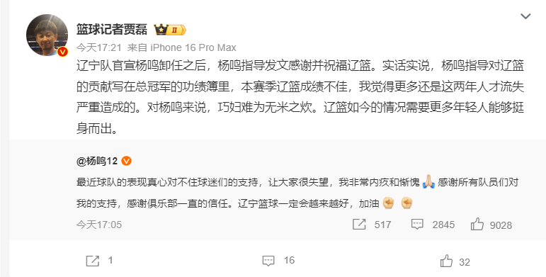 熟悉的个人身体原因,杨鸣指导辞职也登上了热搜,因为大家都知道辽宁男篮刚刚经历了一波四连败,杨鸣指导很可能是球队的替罪羊。
